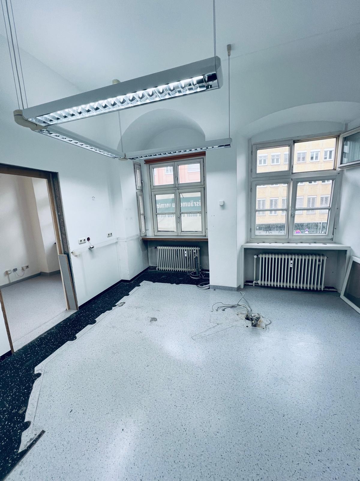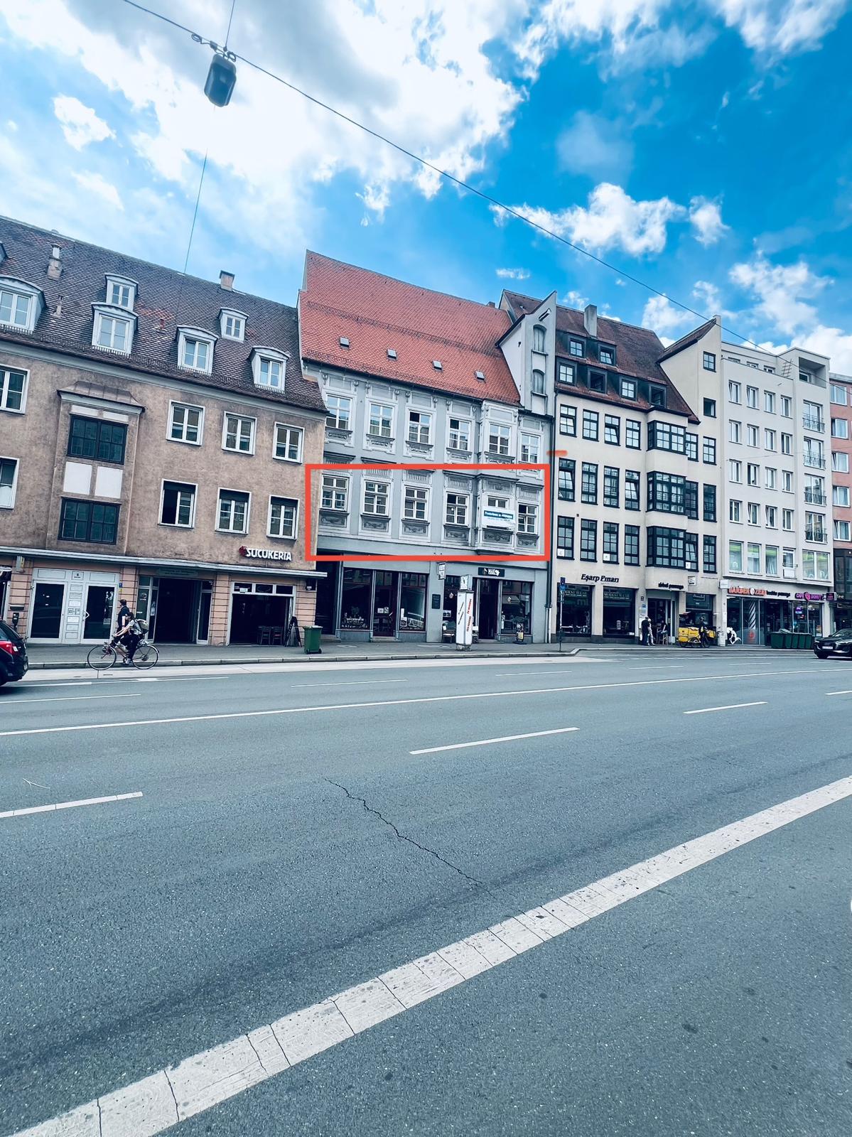 Diese großzügige, rund 230 m² große Gewerbeeinheit befindet sich im 1. Obergeschoss eines denkmalgeschützten Wohn- und Geschäftshauses in absolut zentraler Lage – direkt an der Karlstraße, einer der wichtigsten Verkehrsachsen Augsburgs.
