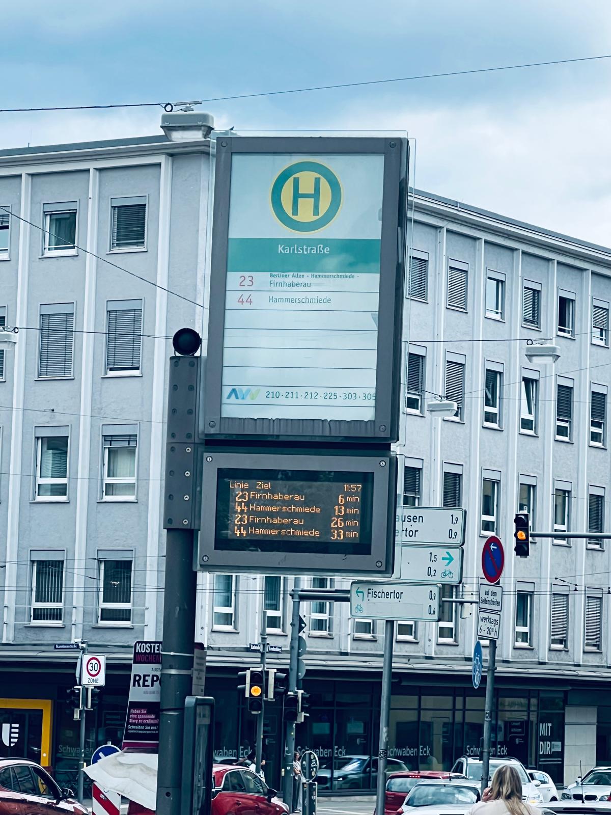 Direkt vor der Haustür befindet sich die Haltestelle "Karlstrasse", eine von den wichtigste Verkehrsknotenpunkt im Augsburger Nahverkehrsnetz. Hier kreuzen sich zahlreiche Straßenbahn- und Buslinien, die eine schnelle Anbindung an alle Stadtteile sowie den Hauptbahnhof gewährleisten. Dieser ist vor der Haustüre. Auch die Anbindung an den regionalen und überregionalen Bahnverkehr ist somit ideal.