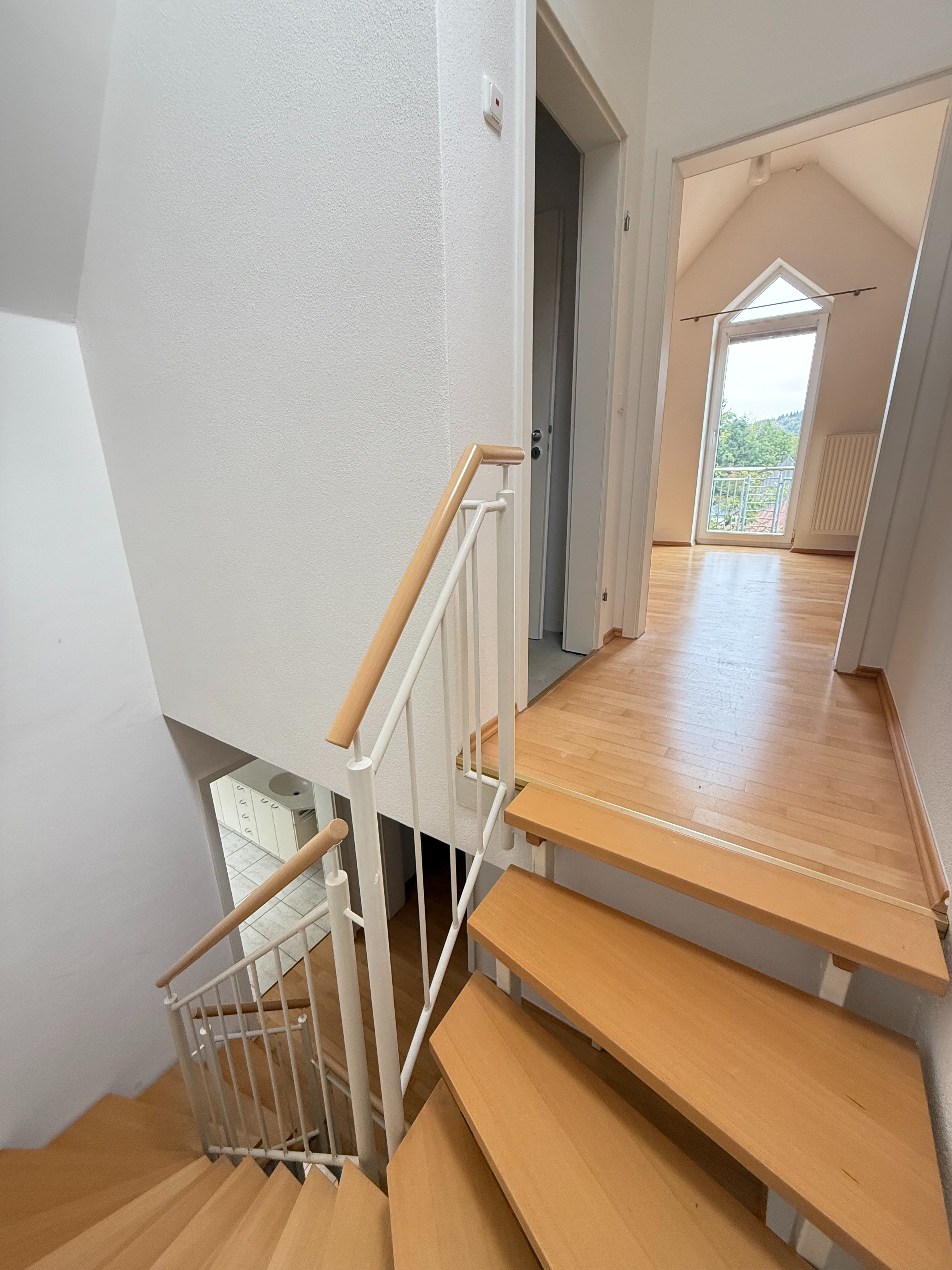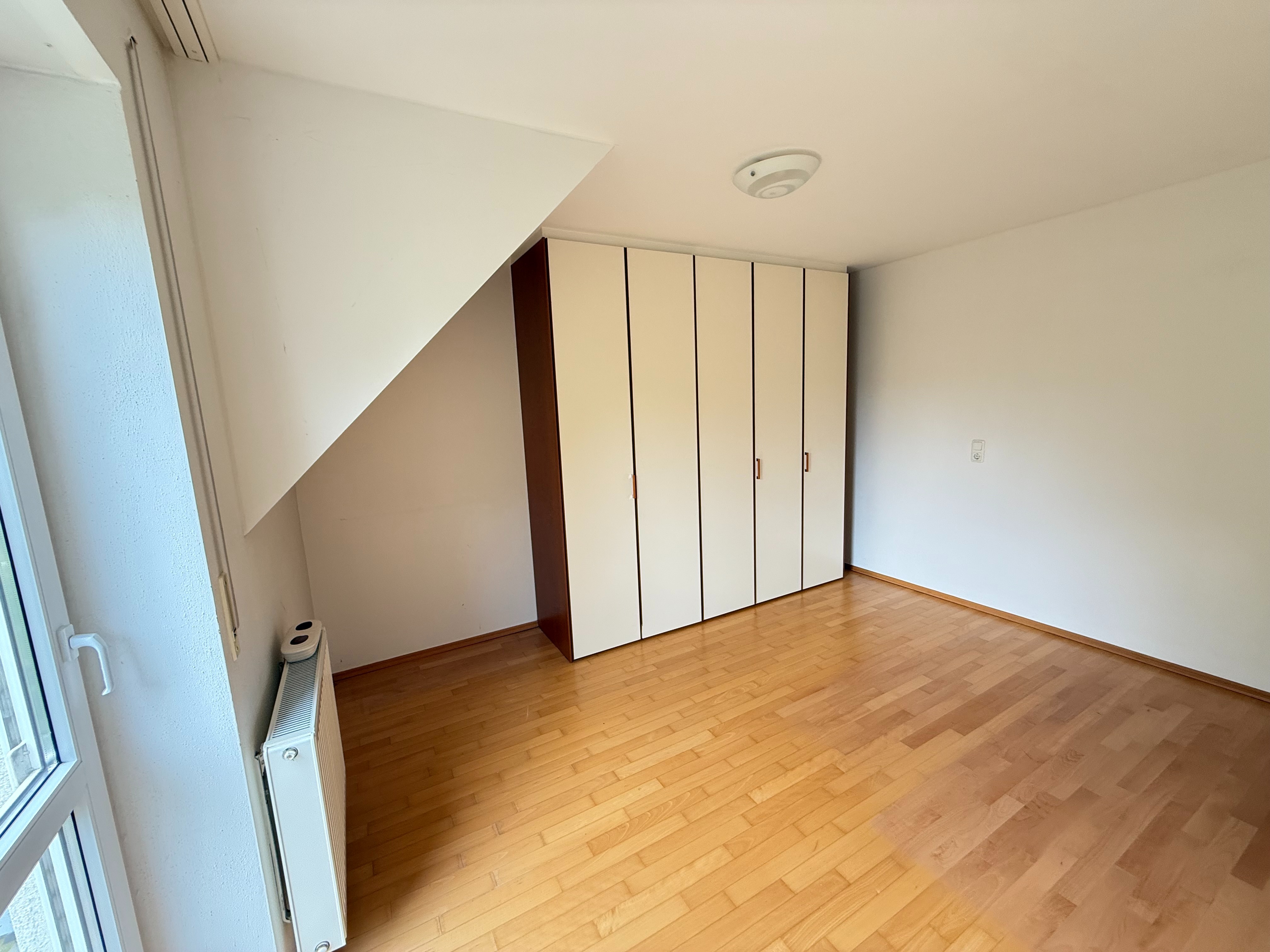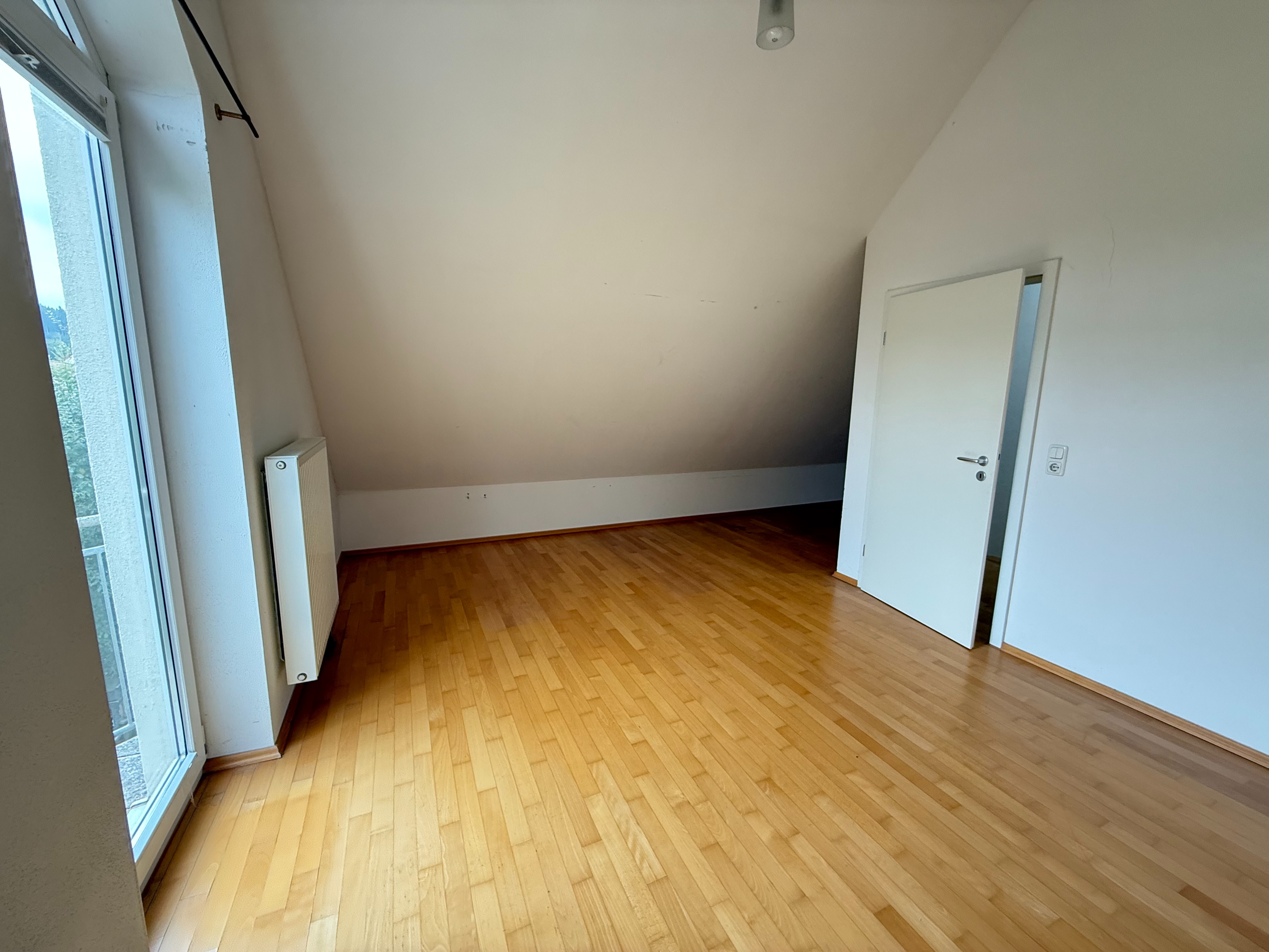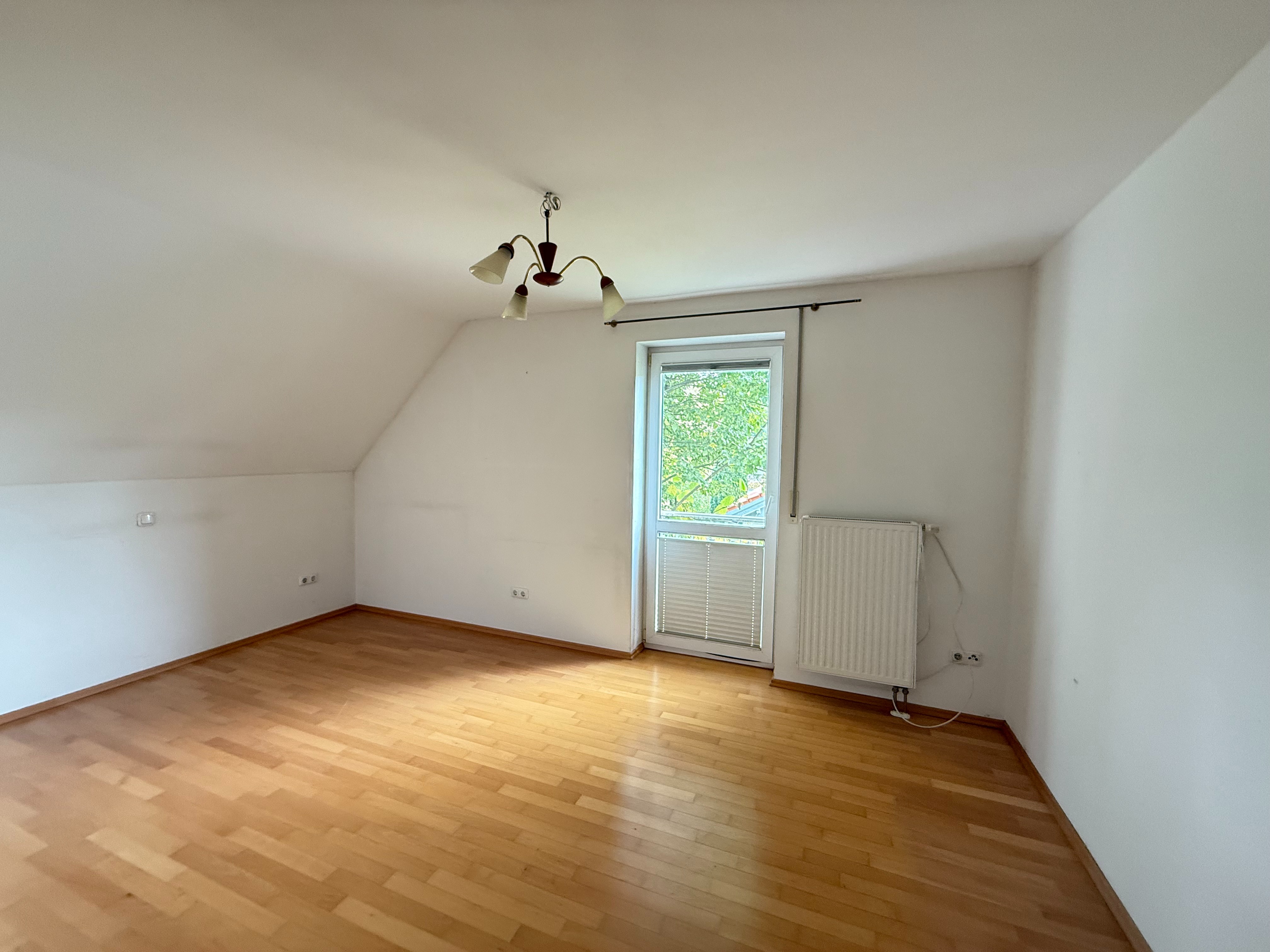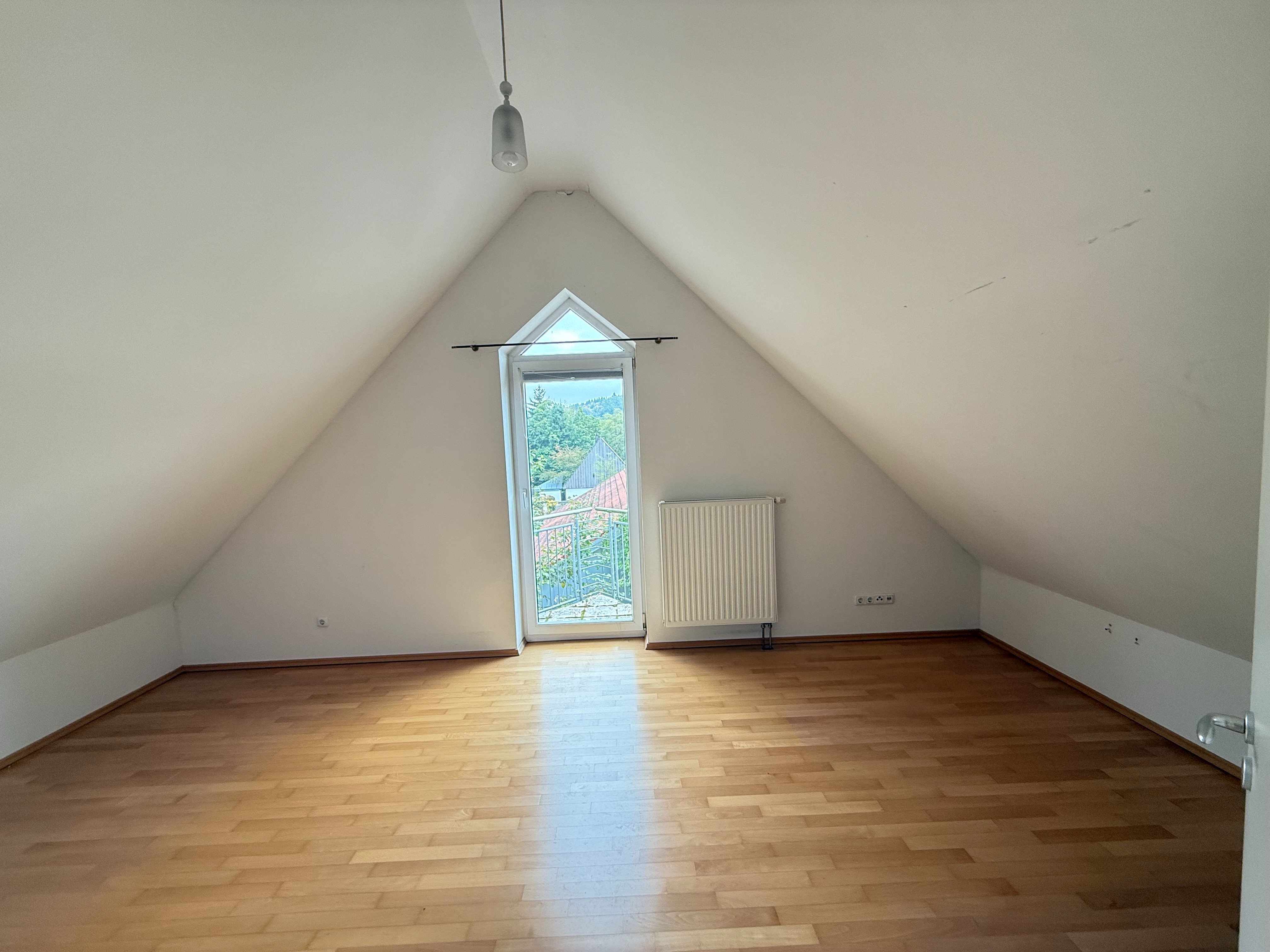 Im Dachgeschoss befindet sich ein weiteres gemütliches Schlafzimmer mit eigenem Balkon. Zudem gibt es hier den Heizraum, der zusätzlichen Stauraum bietet.