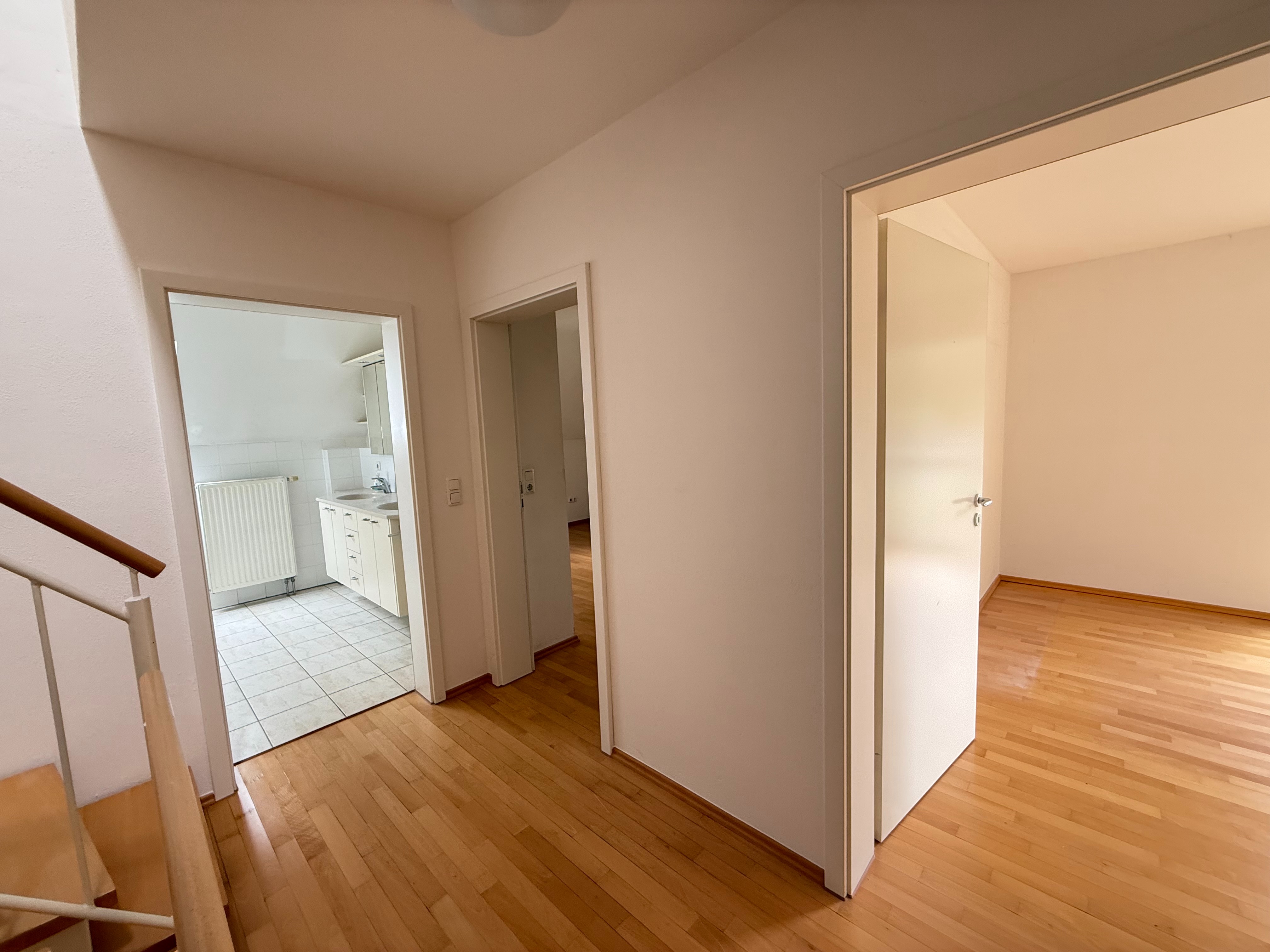 Das Obergeschoss verfügt über zwei geräumige Schlafzimmer. Eines davon ist mit einem zusätzlichen Ankleidezimmer ausgestattet, das sich alternativ als drittes Schlafzimmer nutzen lässt. Das helle Badezimmer bietet mit Badewanne, Dusche, Doppelwaschbecken und Fenster hohen Komfort. Ein Balkon sorgt für zusätzliche Entspannungsmöglichkeiten.