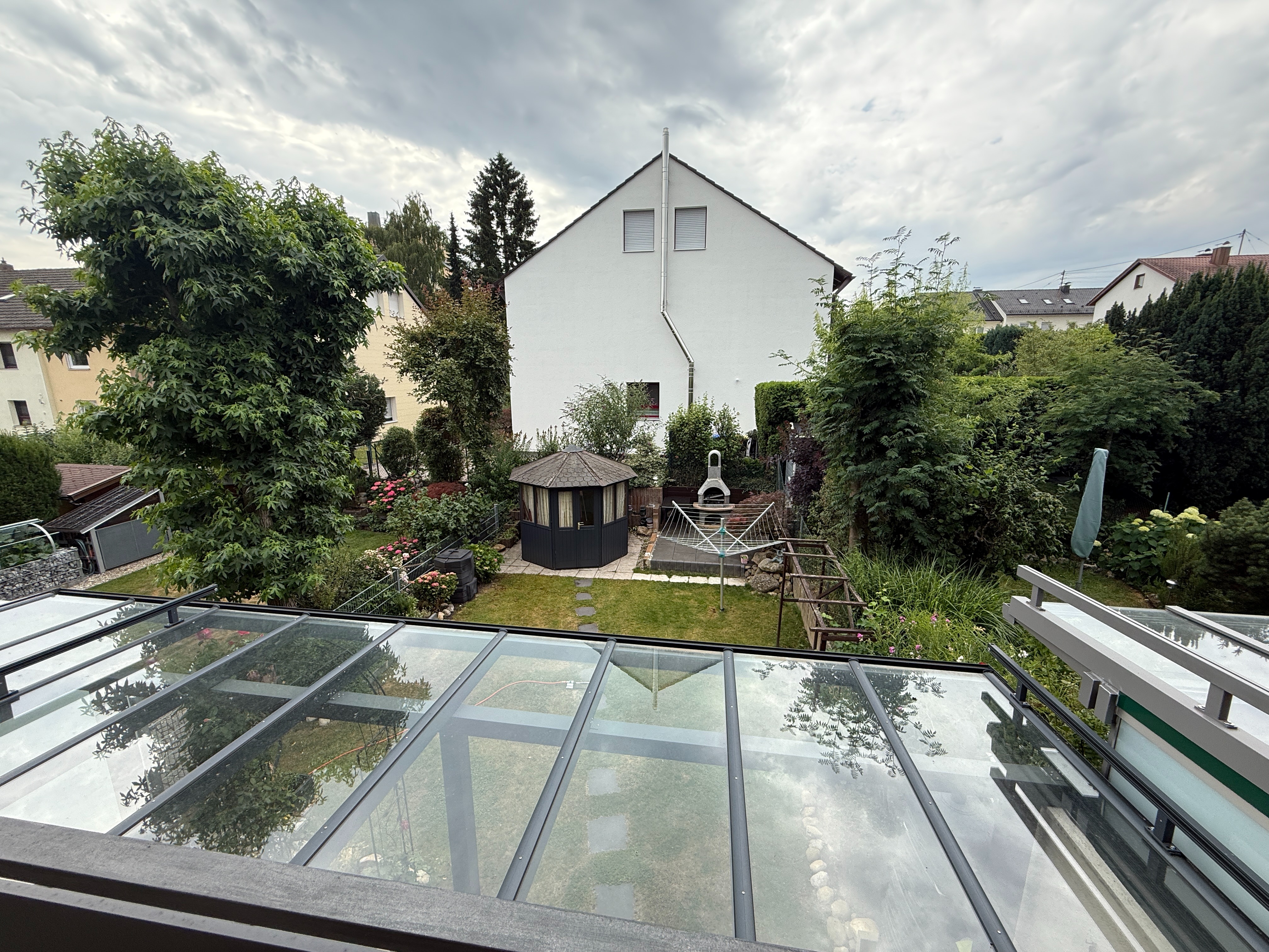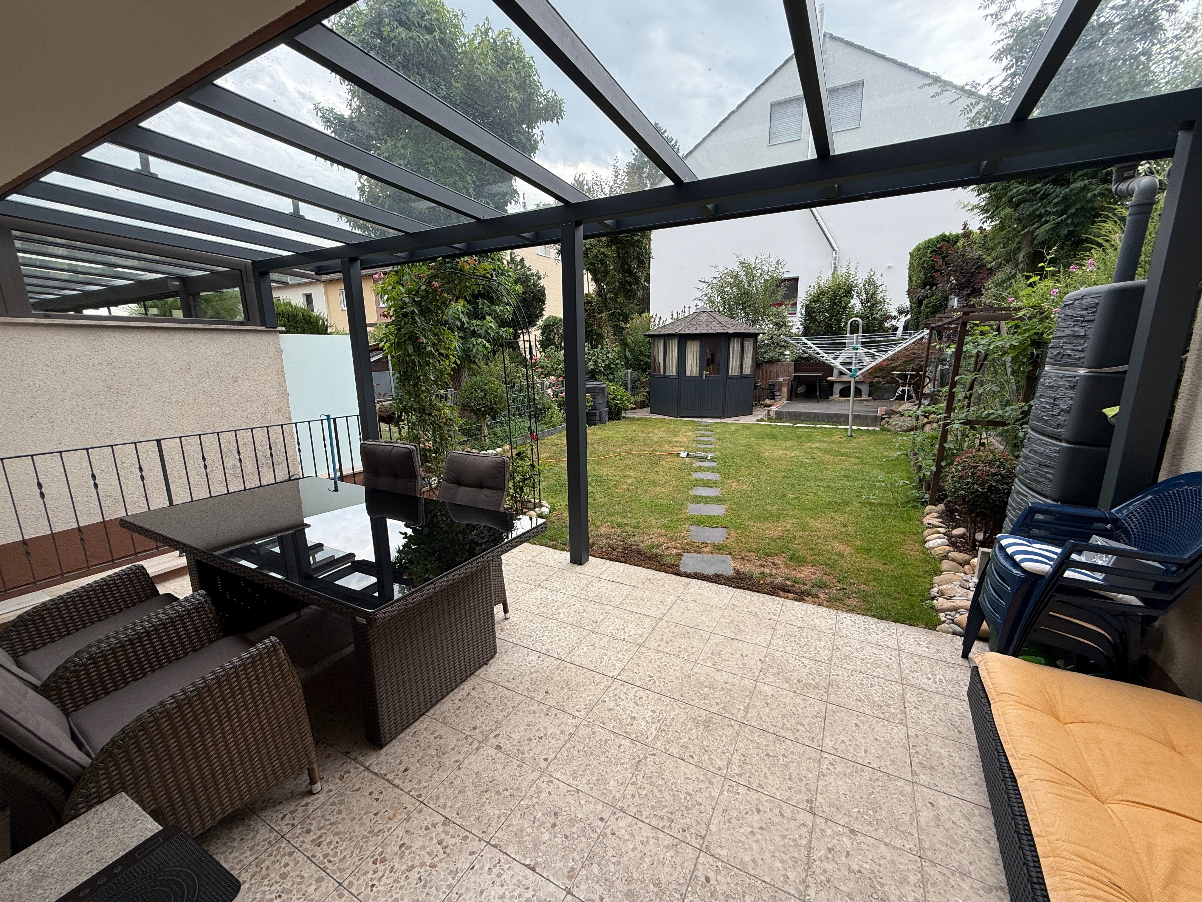 Der liebevoll gestaltete Südgarten mit Gartenhäuschen und neuem Glas-Alu-Vordach über der Terrasse bietet Erholung pur. Ein Treppenabgang führt direkt vom Garten in den gefliesten Keller.