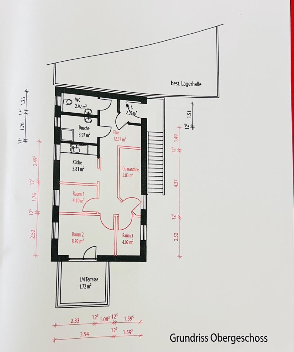 Das Büro liegt im 1.OG und hat eine Einbauküche, Dusche, WC.