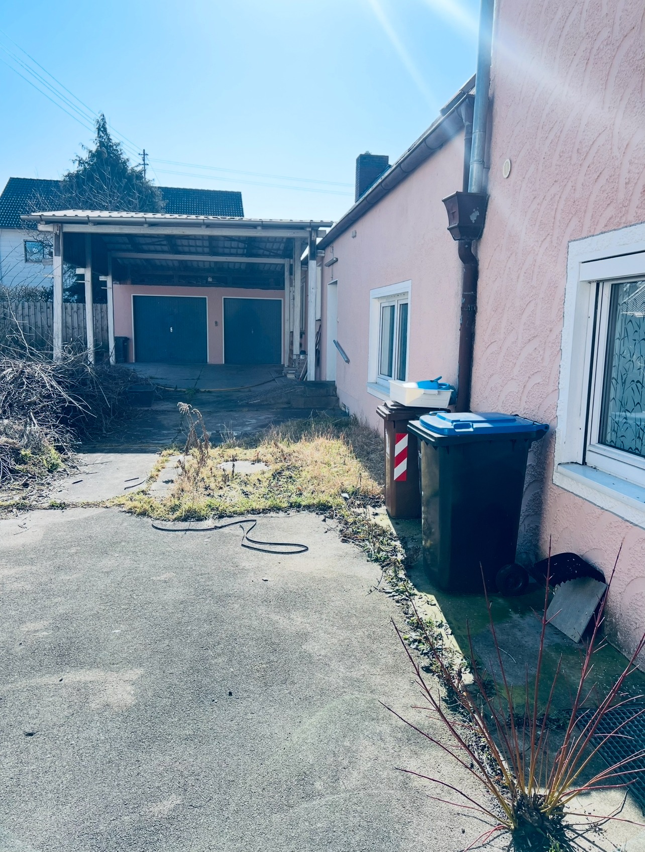 Es sind 2 Einzelgaragen vorhanden, eine davon ist größer. Der Garagenvorplatz ist großflächig überdacht – Ideal für trockene Be- und Entladungen.